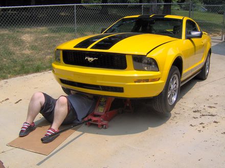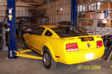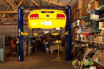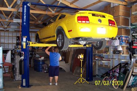 The first real car on the lift for any real work was Cameron's Mustang... it was finally time to do an oil change and tire rotation the easy way...