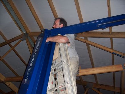Now for the moment of truth...the installation of the top plate between the two posts...Joe allowed it would be all Brian's fault if it didn't fit...since Brian did all the ciphering...evidently all that education paid off and the plate fit!! The top plate was HEAVY!!