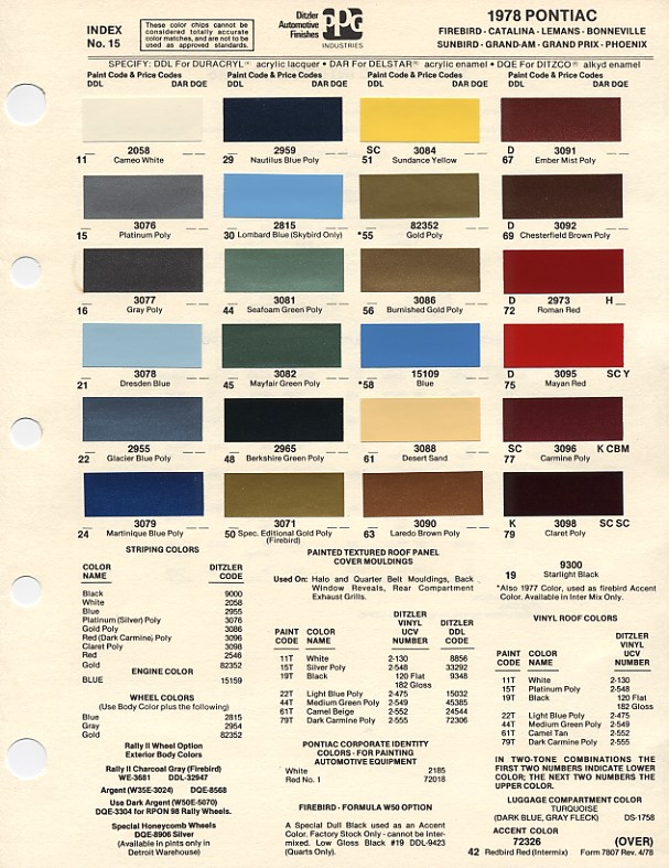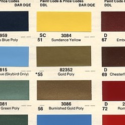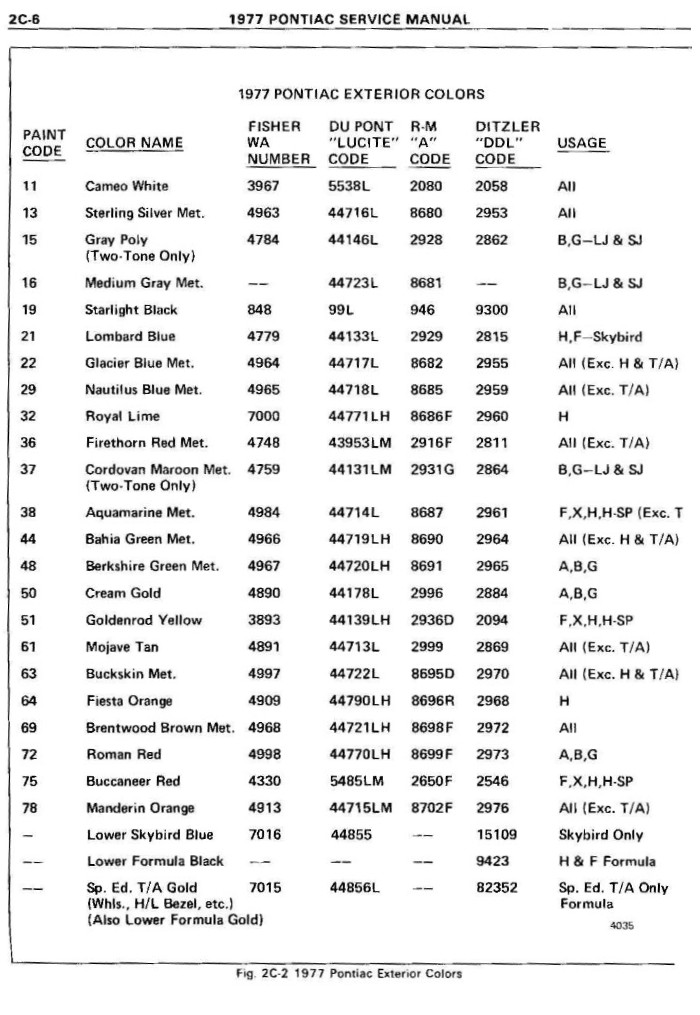 In 1977, no paint chip exists that makes sense, but the gold "accent" color was given in a table (left) in the PPG paint chip sheets. The blue accent color here is for Skybirds. There has been a lot of debate about whether the wheels and grilles were the same color. I looked for a hard reference to this for years, and I have to thank Heeter Thomas for actually pointing out where it was. It's page 2C6 out of the ordinary shop manual (below.) Look at the last line in the picture below. This anwers all the questions for 1977.