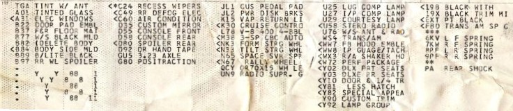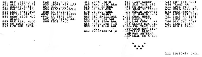 Here's a section of a build sheet for a 1979 Special Edition without T-tops. T-tops would be CC1 or WY9, if the car had them. This is a Van Nuys car, as evidenced by the little WS6 symbol. They didn't have the big Y84 like Norwood build sheets.