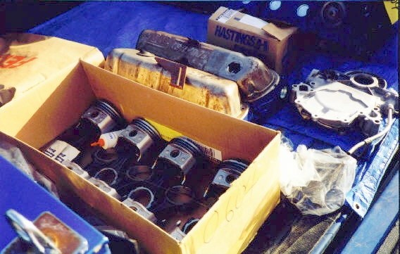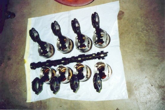 | This is almost as good as getting presents at Christmas... we sent the disassembled engine to our local machine shop for proper cleaning, machining and new parts. | Here's the pistons, rods, and camshaft. We double checked the rods, pistons, and camshaft prior to installation... you just can't be too careful... |