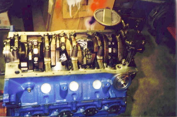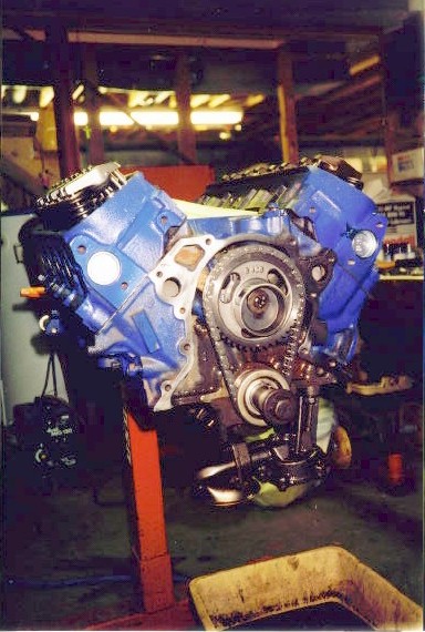 | Here's a picture of the assembled bottom end. We double checked the bearing clearances, piston ring gaps, crank end play, rod and main torque specifications... well you get the idea... and made sure everything was lubed. | The long block assembly is almost complete. The heads had a 3 angle valve job and new valves. Joel wanted his engine rebuilt completely stock and original... two barrel heads and intake included. |