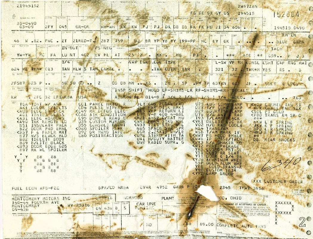 Here's the build sheet from my first Y88 Gold Edition Trans Am. It had a few more options that my current Gold Edition. If you have a Y88 and this build sheet matches your VIN, I'd like to talk to you!!