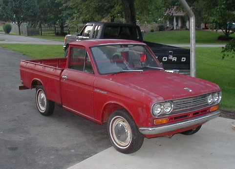 I just bought Godzilla in July, 2005. Testing the boundaries of coolness, this bulldog-ugly creation is a 1970 Datsun PL521 pickup. The styling is right out of a Godzilla movie, and the performance, with 96 gross hp and a 4.375:1 rear axle, is glacier-like. But I love it!My father bought a 1967 model in about 1971. It was the first Japanese car I had ever seen. The Japanese car manufacturers had started in California, and sold their way east until they covered the whole country. 1967 Datsuns as far east as Virginia were very, very unusual. While I'm a major purist when it comes to Trans Ams, I'm totally the opposite about stuff like Godzilla. Although, this truck is so original it is going to be hard to modify it. Look at those hubcaps! |