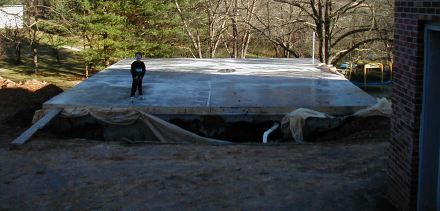 The concrete is now poured, and I was amazed at how much they put on top of the structure. Based on the bills of lading I have, it appears this structure weighs about 60 tons above the foundation (the foundation weighs another 18 tons). I'm just amazed at what I have built. The dead load is so high that the weight of cars on top of the slab is of no consequence. If there's a tornado, this is going to be the place to be. At one time I was a little bit worried about putting the lift on top of this. What was I thinking? | ![]() |