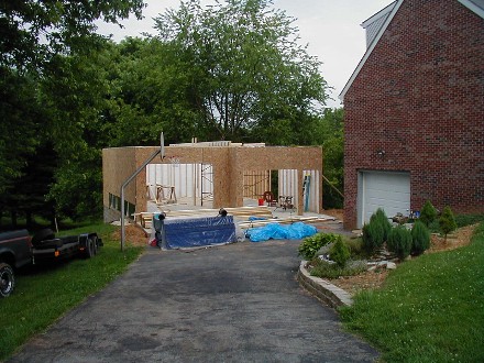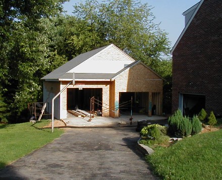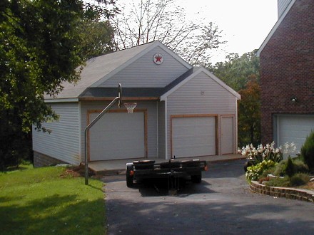 | It's been one year since I dug the basement for the garage. It almost looks like civilized people have moved into my house, but of course we know better. I still don't have that gas station light fixture up, but it's looking pretty good anyway. Go back tok the "artist's rendition" and see how I did. | ![]() |