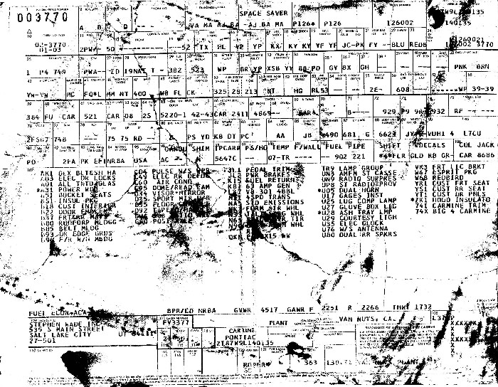 Lucy's Build SheetLots of fun stuff to notice on the build sheet. First, this drivetrain was available as a Trans Am delete option. The engine code, PWA, and transmission code, ZD, match 301 4-speed Trans Ams. Apparently this is a Borg-Warner Super T-10 transmission (what a waste of machinery). The posi 3.08 axle is also the same as used in 301 4-speed 1979 Trans Ams. But in spite of all that, the car still has whitewall tires and no rear sway bar. It doesn't even have a rear spoiler! WS6 obviously was out of the question.In the luxury department, Lucy is heavily optioned like my Skybird. The major options include power windows, power locks, hobnail cloth interior, tilt, AMFM Cassette, dual rear speakers, deluxe lamp group, gages, and tach. This in addition to the standard Esprit options, like all the chrome decor and deluxe sound insulation, and also in addition to the Redbird package, which included Formula steering wheel, snowflakes, and color-keyed seat belts. I can't imagine that this car wasn't special ordered, but the build sheet doesn't show it! Can you imagine this car in dealer stock?