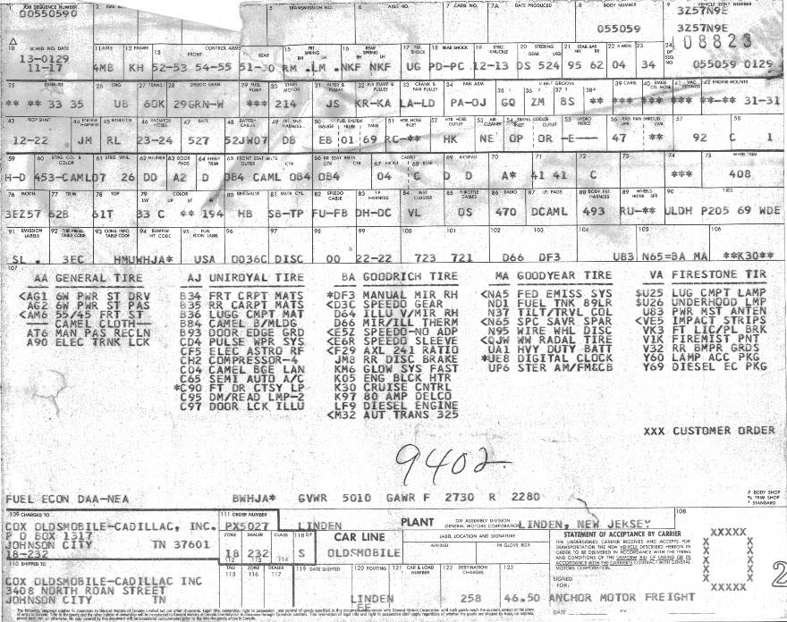 Mr Bays has to be credited for starting my interest in build sheets; I found it, behind the rear seat as usual, while I was putting in a pair of Alpine speakers. We have a large collection of Trans Am build sheets, and my observations about them are shown on the Build Sheet Bingo page. There are some interesting similarities, like the handwritten number, some of the RPO's, and the big "O" in the corner (telling us that P on the Trans Am build sheets is for Pontiac.)