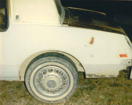 This is the only picture I have showing the original top. Mr. Bays was a bronze color (Carmel?) with a fluffy tan top and Camel Tan interior. In this photo I had shot primer on the quarter panel because of some minor surface rust coming out from under the top. I was taking a night "auto-body" class just for fun. | ||||||