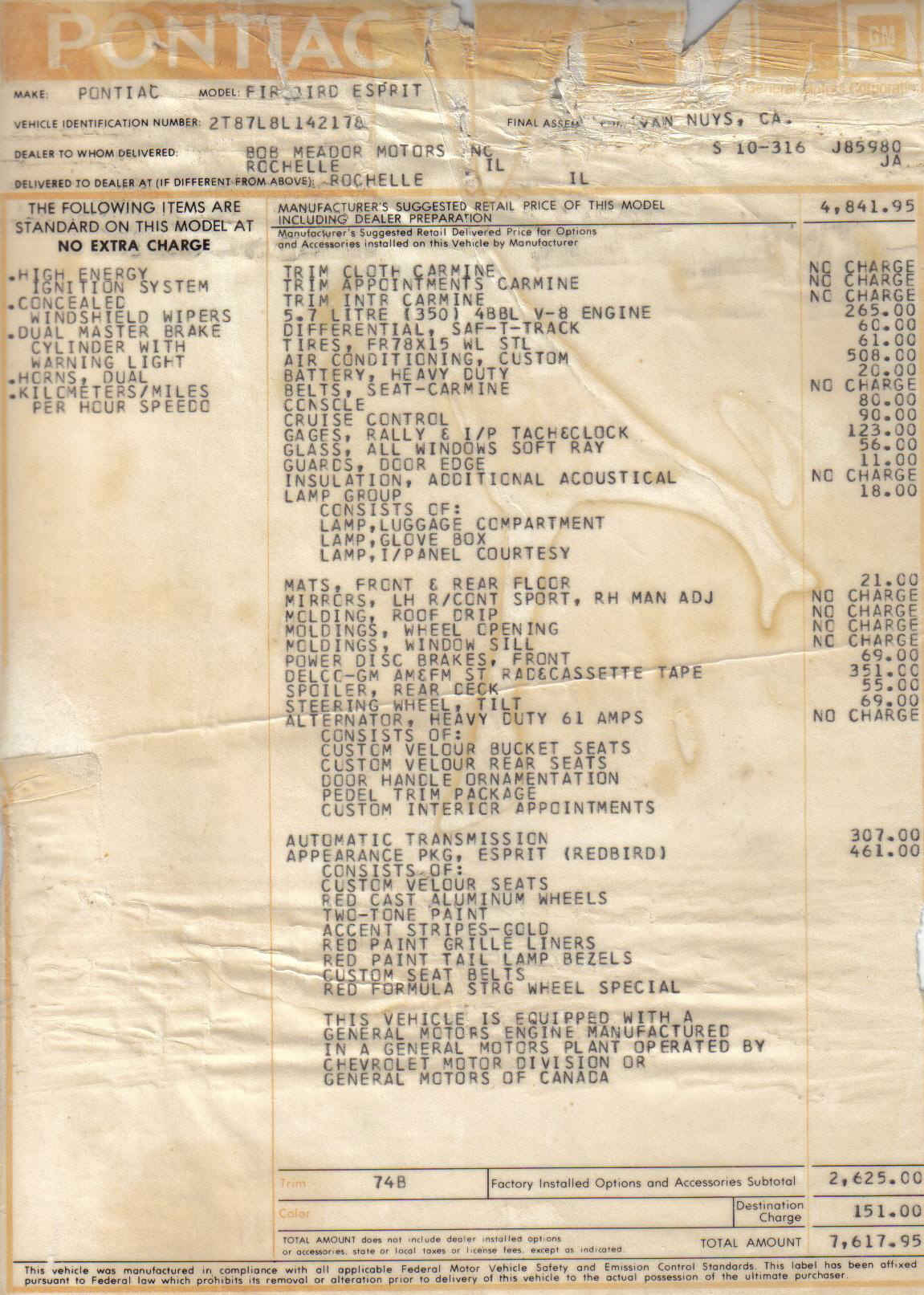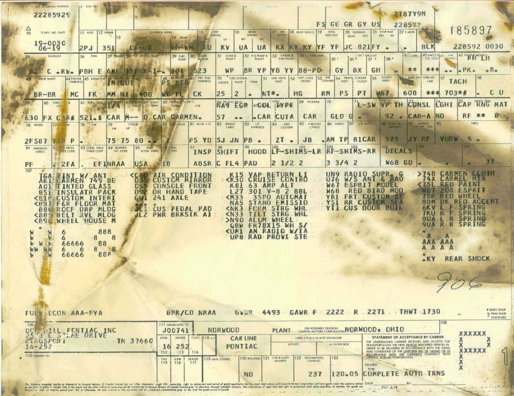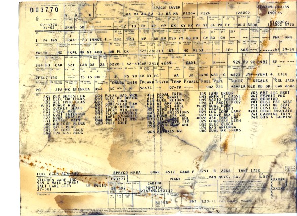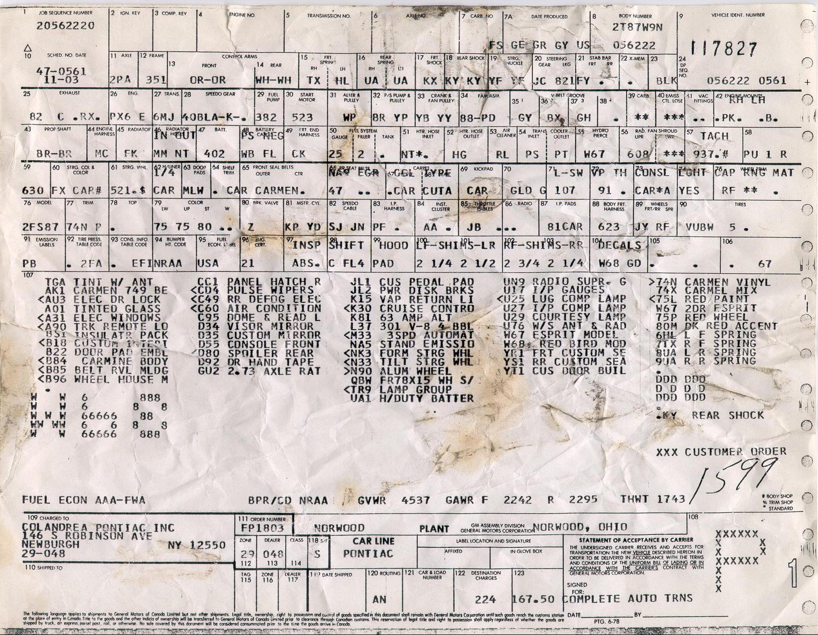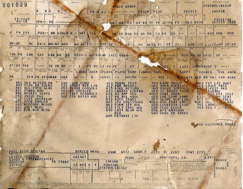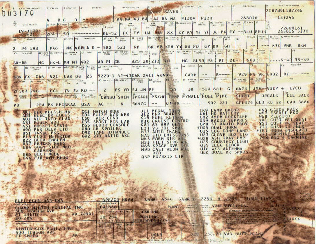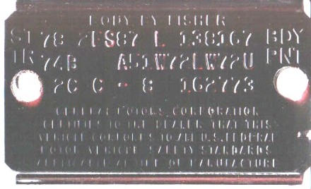 Transcription of a tagST 78 2FS87 L 190226 BDYTR 74B A51W 72LW72U PT 04C C-8 146851 From Aero Appraisals, showing the Roman Red code in 1978 | Transcription of a tagVIN #: 2T87L8L177XXXST 78 2FS87 L 246889 BDY