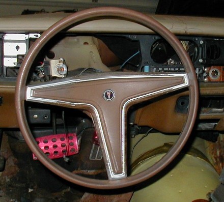 | N30 Deluxe Steering Wheel - Just for comparison, here's the deluxe steering wheel, which is coded N30. It has woodgrain around the edges (partly worn away on this example), and it was color coordinated. Check out the silly pink brake pedal. | ![]() |
