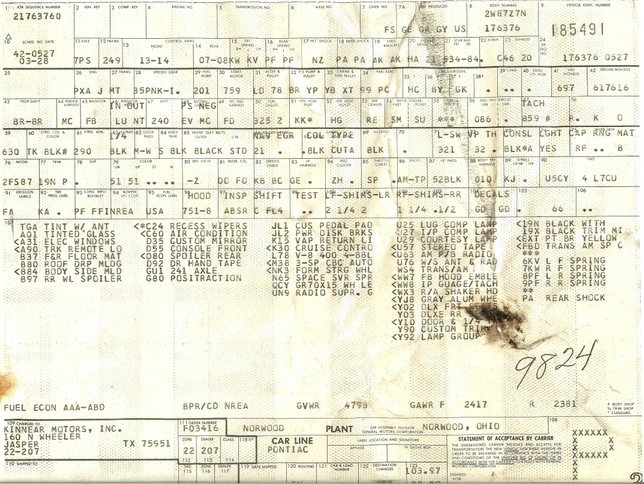 The first one is a rare yellow 1977 Trans Am. The VIN sequence is 185491, and the penciled number is 9824.