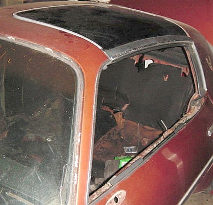 | Here's an end shot showing the aluminum bracket and the aluminum channel that runs around the edge of the t-top glass. The aluminum bracket is glued/sealed to the t-top glass as is the aluminum channel. I think it is possible to replace the aluminum channel that runs around the edge of the t-top glass, but don't think I'd mess with the aluminum bracket. |