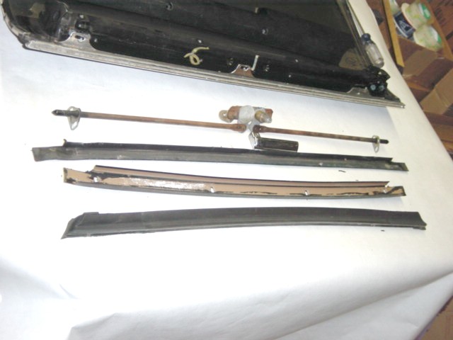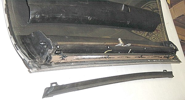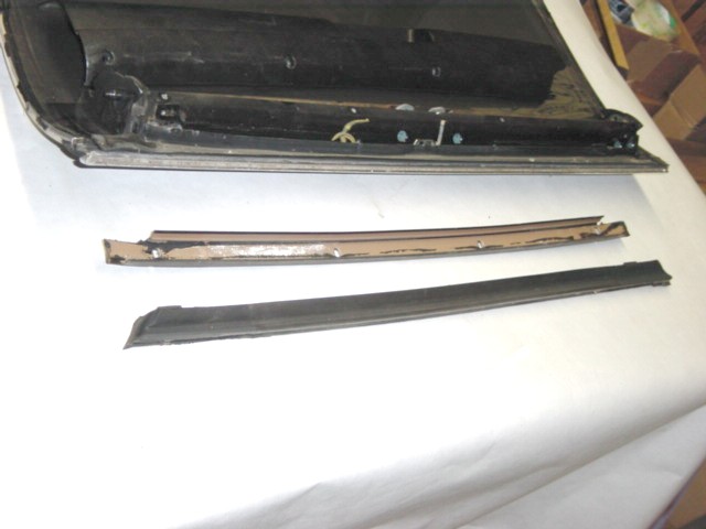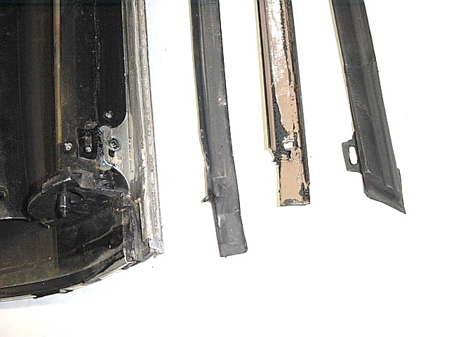 | Here you can see the light brown metal channel that holds the weatherstripping. There are 4 Phillips head screws that retain the metal channel that you'll have to remove to get the channel out. Notice the strip of rubber between the metal channel and the drip rail molding. | |