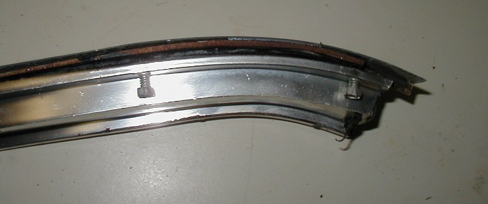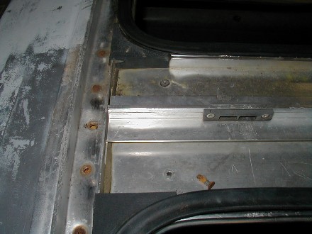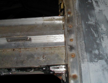 | When the weatherstrip channels are removed, the joint in the main aluminum pieces is visible. The aluminum pieces overlap about 2" here so that the 5 screws can sandwich everything together. Notice (especially on the far side) that both pieces have a vertical aluminum rib that meets are right angles.It forms a dam that keeps water outside the car, so this joint needs to be caulked. The weatherstripping channel was mounted just beside this vertical rib. | ![]() |