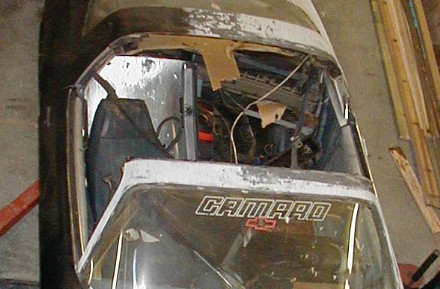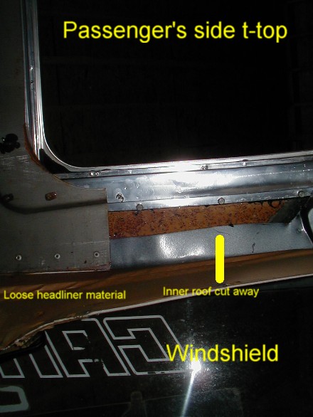 It may be hard to tell what you're looking at in this photo. This photo is inside the car, looking up at the roof on the passenger's side front. The reverse word "Camaro" is at the top of the windshield. The complete setup, including weatherstripping and t-top, is in the car. I have pulled away the headliner but it's just flopping loose and messes up the picture. |