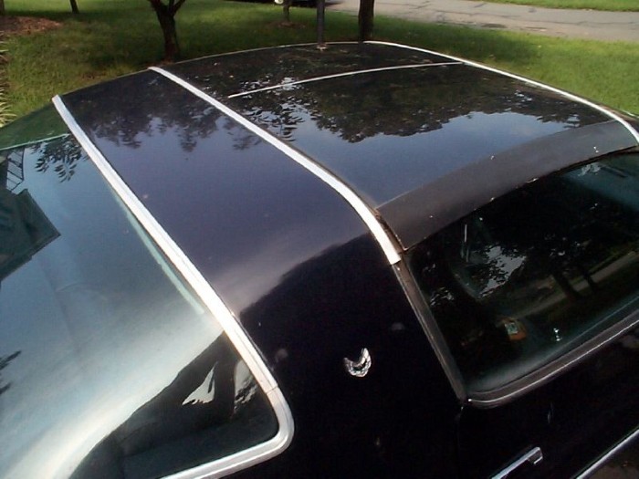 | This outside view shows the general layout of the C and C setup. There are aluminum rails clamped to the roof in front and back. These are "bridged" by an aluminum spine with a heavy steel brace hidden underneath. The spine had slots for the t-tops to hook in along the center of the car. Weatherstripping was in a separate aluminum channel which was screwed to the 3 main aluminum roof pieces with lots of sealant. There is a LOT of room for rain to run off in this design. The weatherstripping is high and dry above the channels where water would drain. | ![]() |