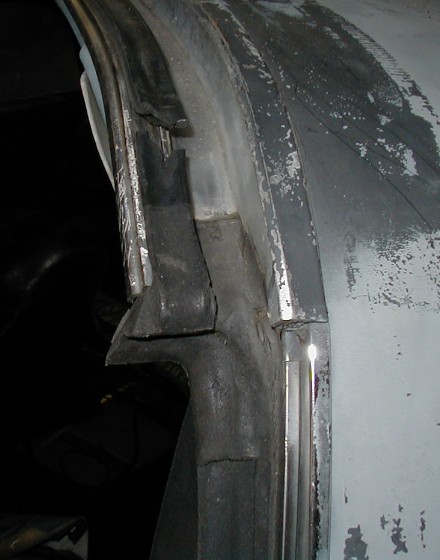 | Once the weatherstripping is removed, you can see where the weatherstrip jumps from original GM channel to the C and C channel. The weatherstripping is somewhat unsupported in this spot, but it's tiny compared to the same transition on the Hurst Hatch. |