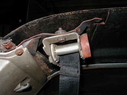 At the seat belt reel, the panels weren't parallel, so the inner panel was cut back out of the way. I wouldn't feel too safe wearing this seat belt, but in the 70's nobody wore them anyway. |
