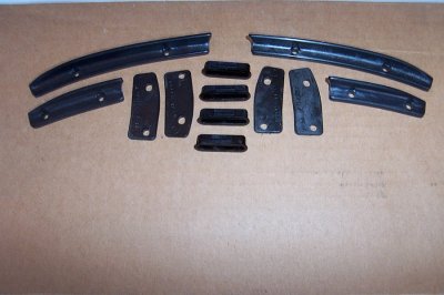 | When these particular Firebird recall kits were made, they came with a short interior molding, with a number of small pieces that shaped the end. This is the "early" recall kit. | Here are those 8 short pieces. This setup looks like a big molding that was broken into a bunch of pieces by accident, so it's important to know it was supplied this way. The 4 pieces in the middle are new sockets to snap in the slots in the old t-tops. |